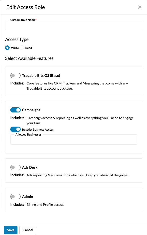- Details: You can create custom roles with specific access for particular Tradable Bits business accounts, Fan CRM, Sales and Ads Access