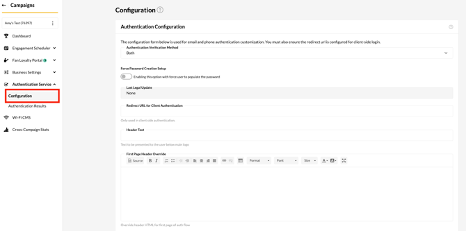 Authentication Services is set up within your campaign business accounts. This means you can have different "one-click" sign-ins for each of your businesses (if you have a different business account for each of your sponsors, for example). To access the section, enter your desired business in Campaigns, expand the Authentication Services section and click on Configuration