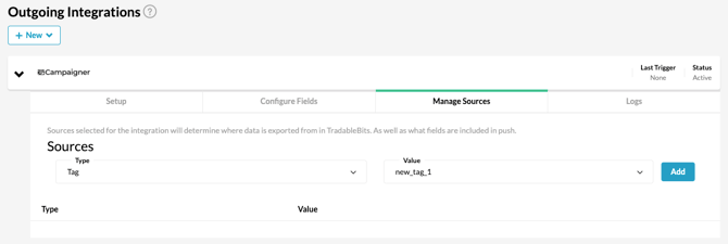 6. Click into the Manage Sources tab and select your source type and value. Click Add