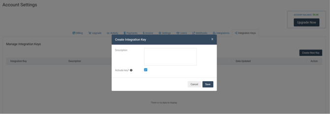 6. Click on Create New Key and add a unique description that will help differentiate what this key is used for