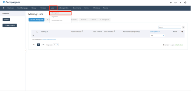 2. On the top navigation bar, select Lists, and Mailing Lists