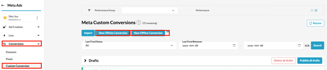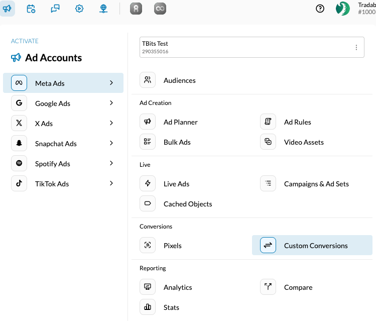In the Tradable Bits Homepage, hover over the Ad Accounts section in the Top Navigation Bar, click Meta Ads, select your desired ad account and click Custom Conversions.