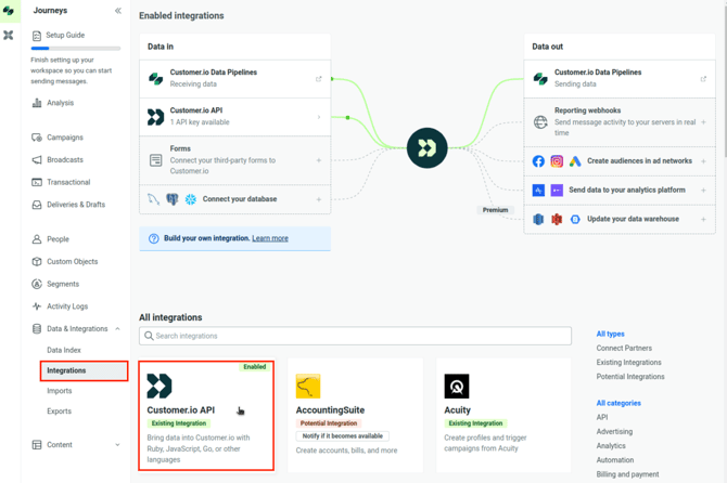 2. Navigate to Data & Integrations>Integrations from the left side menu and select Customer.io API
