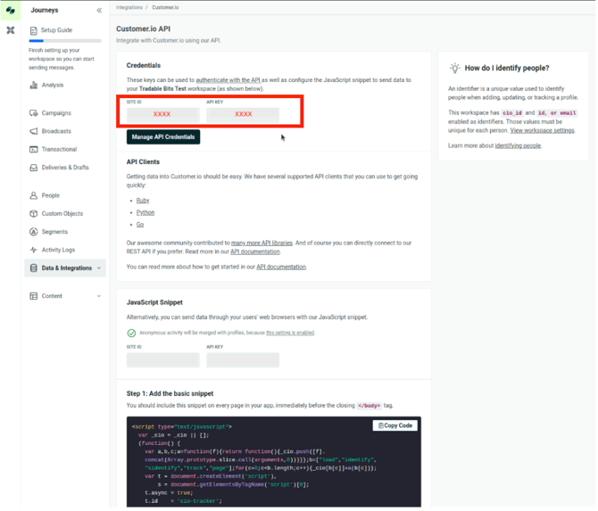 We'll start on the Customer.io side and then return to Tradable Bits to complete the set up!