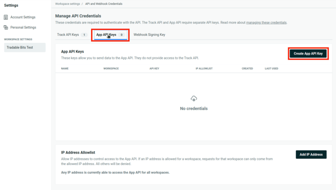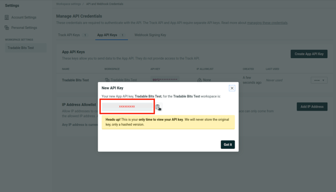 Note down your App API Key and save it in a secure place. You will NOT be able to see this key again and you will need it to complete the set up on the Tradable Bits side later.