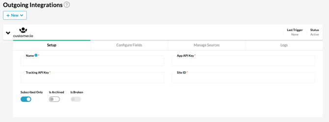 5. Give your integration a name and input the Tracking API Key and Site ID that you saved from step 3 on the Customer. io side and the App API Key from step 6