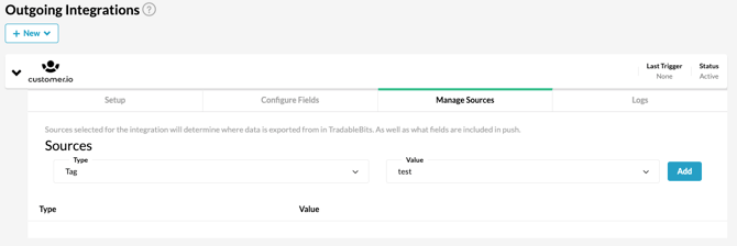 6. Click into the Manage Sources tab to select your source type and value. Click add