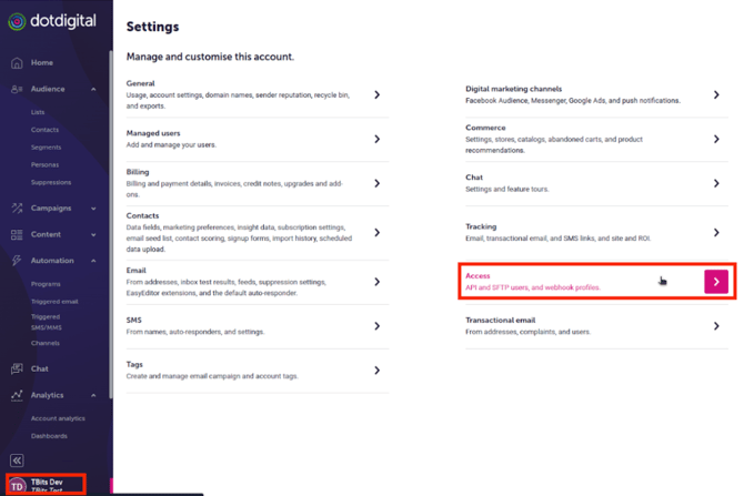 1. Begin by logging in to your Dotdigital account and clicking on your profile icon in the bottom left