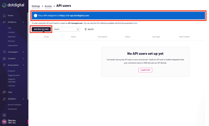 3. Select an existing API User or create a new one. Your API Region URL is displayed at the top of the page