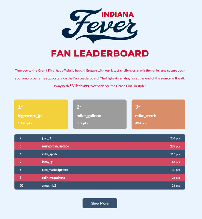 - Campaigns with accuracy-based scoring leaderboards (e.g., Memory Match, Trivia) won't appear in the leaderboard unless Fan Points were added during setup.