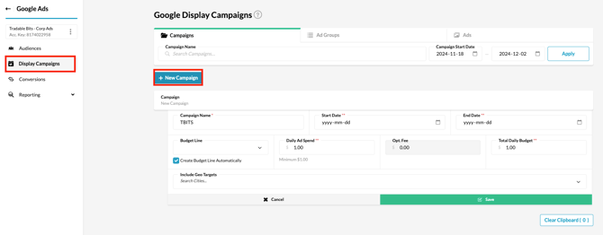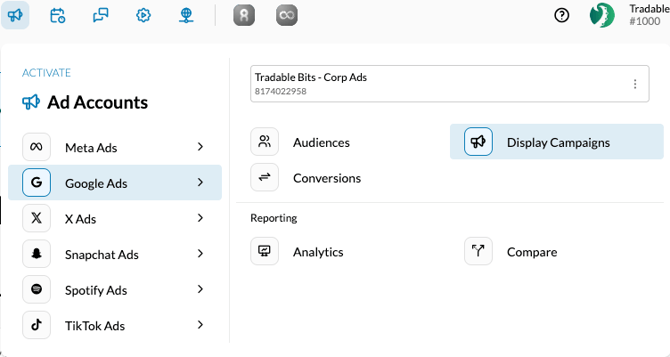To access the Smart Display Ads creation section, In the Tradable Bits Homepage, hover over the Ad Accounts section in the Top Navigation Bar, click Google Ads, select your desired ad account and click Display Campaigns. Ads Planner is the centralized location for the entire set up of Google Smart Campaigns.