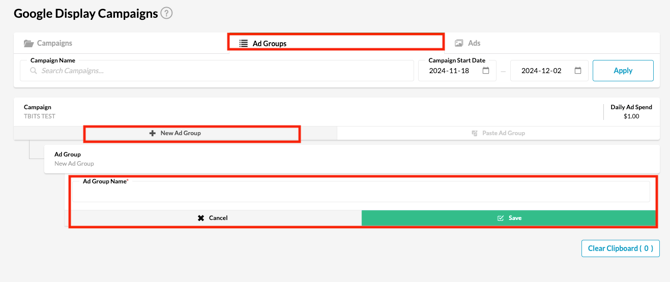 4. Click "Ad Groups" at the top of the page, and click "New Ad Group" against the corresponding campaign.
