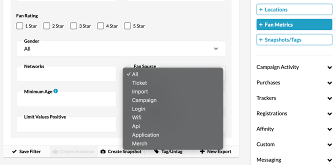 The reverse method of an individual fan profile search is searching for all fans that entered your CRM through a source type. You can search for all fans who have entered your database through a campaign or other fan source by using Fan CRM Search and toggling on a specific function.