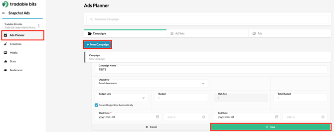 When you arrive at the Manage Centre of Tradable Bits, you’ll find your Snapchat Ads Tools on the right side of the UI in the ‘Market Smarter’ section, under Ads Planner.