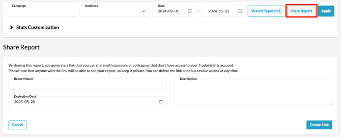 Once you have defined an analysis that you would like to share externally, you can do so with a simple link. This link can be deleted at any time, therefore you can revoke access at any time. To generate a shareable report scroll to the top of the SMS Stats page and hit Share Report. You will need to: