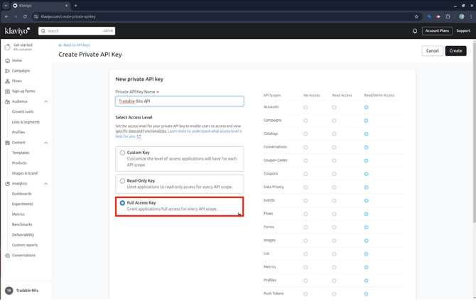 - If your organization has specific rules regarding Klaviyo integrations, create a custom key with Read/Write permissions to List, Profiles, Tags, and Subscriptions and only Read access to everything else.