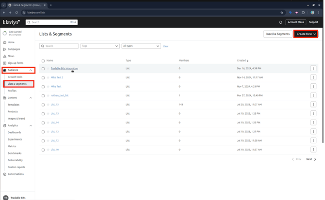 7. Click Create New in the top right corner and take note of the List Name as it will be required later. Your new List will appear at the top of the Lists & Segments page.