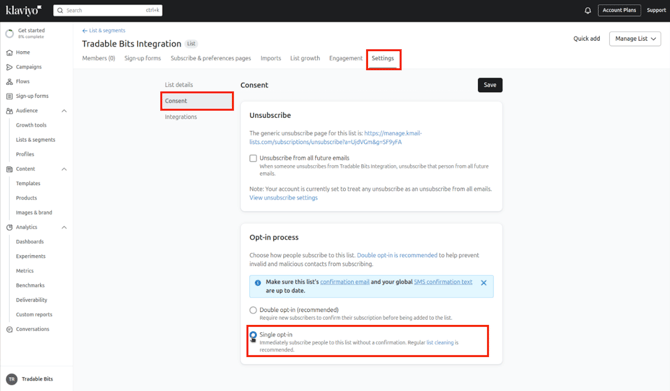 Please ensure that your List has single opt-in turned on so that subscription status can pass seamlessly from Tradable Bits into Klaviyo.