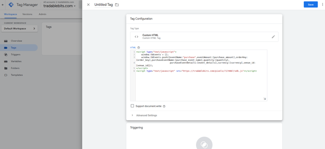 Now, you will paste the Tradable Bits code and use GTM's variables (more in this later) to pull in the dynamic data from the data layer that was set up in Step 1.