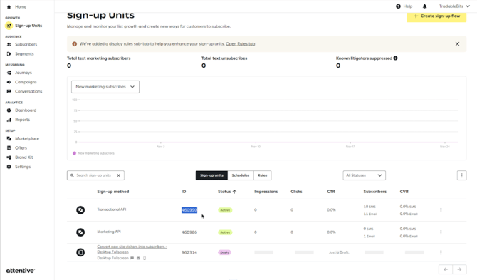 Before you begin, you will need access to both your Attentive and Tradable Bits accounts. Complete the Attentive side of the set up process first before finishing off with the Tradable Bits side of things.