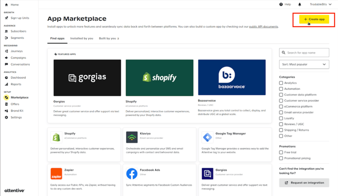 - On the attentive dashboard page, navigate to Setup > Marketplace and then click Create App in the top right corner of the page