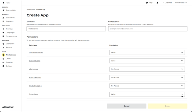 3. When creating the App make sure to give write permissions for Subscribers, Custom Events, and Custom Attributes