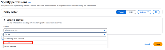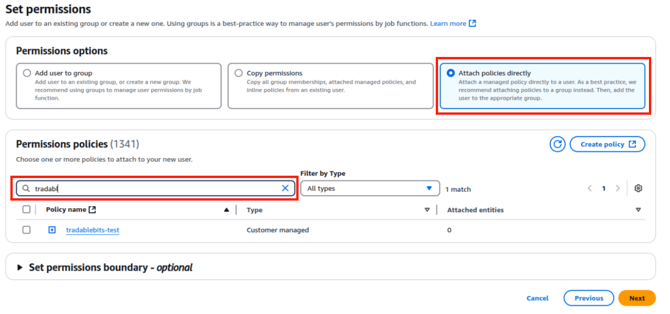7. Next, you will set the permissions. Select Attach Policies Directly and search to find the policy you just created