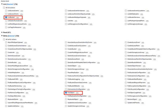 5. Grant both ListBucket and PutObject access to the policy and click save
