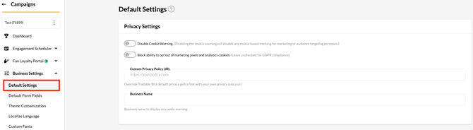Expand the "Business Settings" option from the menu on the left, and click on "Default Settings"