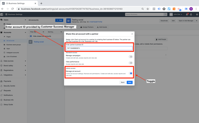 7. In the next pop-up window under Enter partner business ID, paste your partner's business ID.