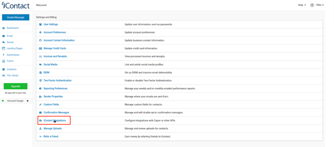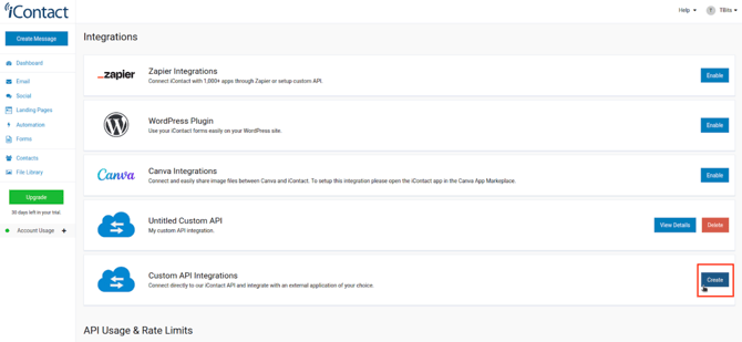 3. In the iContact Integrations menu, click the Create button next to Custom API Integrations