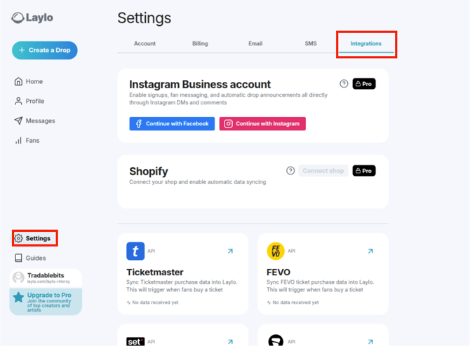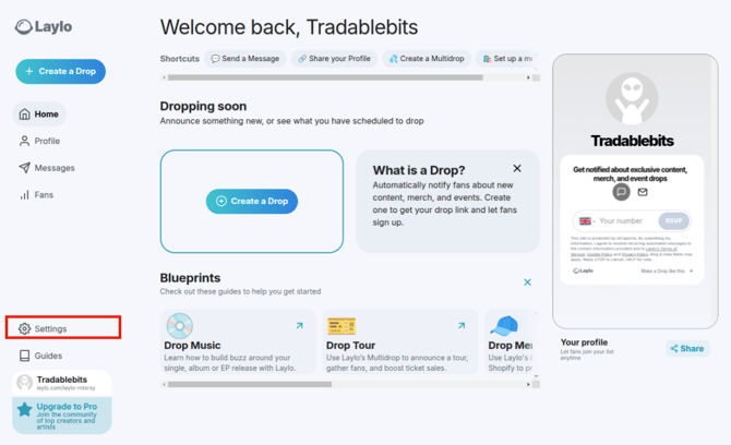1. Begin by logging in to you Laylo account and navigating to Settings in the bottom left corner