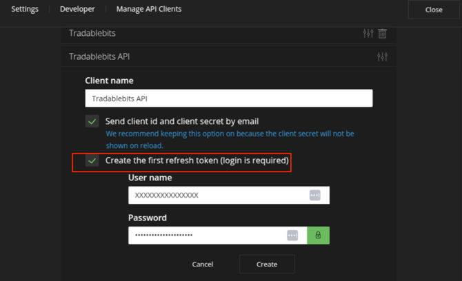3. Create new API client. You can name it anything you would like. Be sure to check the box Create the first refresh token (login is required) in order to get your refresh token