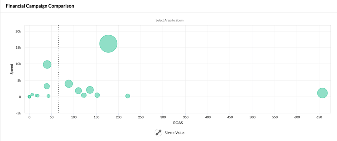 Financial Campaign Comparison: A bubble chart that helps you compare the performance of your various campaigns, in terms of their spend and ROI. The size of the bubble indicates the sales value generated by the respective campaigns. If you would like to zoom in to any specific area of the chart, simply click and drag the area that you would like to zoom in to