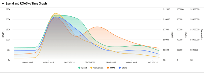 Spend and ROAS vs Time Graph: This graph highlights the performance of Spend, Clicks, Conversions and ROI over the time period selected. In case there's only one of these components that you would like to analyze, simply click on the elements that you do not want displayed from the guide below the graph to remove those elements