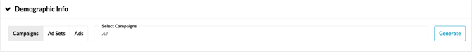 Demographic Info: Enter the Campaigns/Ad Sets/Ads that you would like to get the demographic information for in the text box and click "Generate". The details presented showcase the metric selected from the top of the section. If the "Globe" icon is selected, data presented is broken down by State/Province and if the other icon is selected, data presented is broken down by City