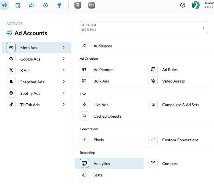 1) In the Tradable Bits Homepage, hover over the Ad Accounts section in the Top Navigation Bar, click Meta Ads, and select your desired ad account that you would like to report on.