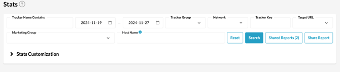 Use the various options presented to filter your results. You can currently filter based on date, the tracker groups, networks that were used or use a specific tracker key. Click "Search" after entering the relevant filters, and if you would like to remove all filters, click "Reset". By default, the system presents stats for the last week across all trackers.