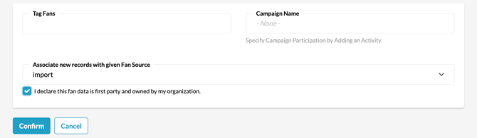 Once you have matched all relevant columns to Tradable Bits’ fields - including your mandatory fields - you have the option to tag the fans in this CSV file with a special identifier, and/or the ability to tie these fans to a specific campaign. To confirm your upload you must tick the checkbox declaring that the imported CSV is first-party data owned by your organization.