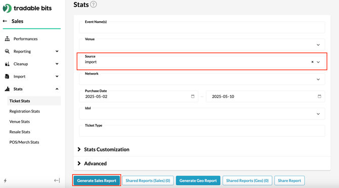 Once you are satisfied with the information you’re pulling in with your CSV file, click Complete. You will be redirected to the Sales Stats page where you can verify your imported data with a quick search. To do this, go to source, choose Import from its dropdown menu and press Generate Sales Report. You will see the information associated with your CSV import.