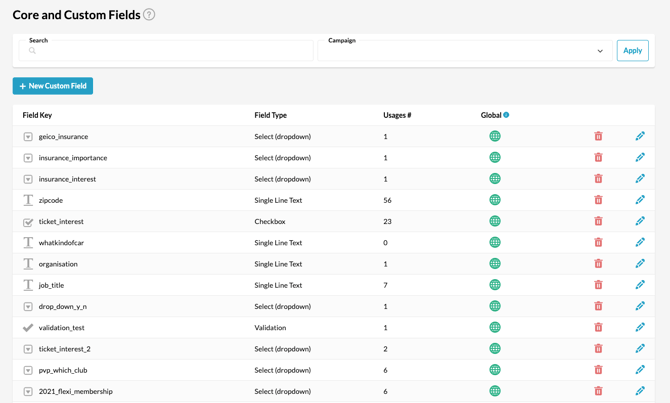 If you would like to view only the fields that are used in any particular campaign, you can choose the campaign from the dropdown at the top and click "Apply" to view only the custom fields used in that campaign.