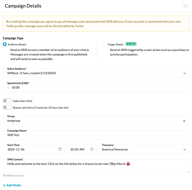 SMS Content: This field is where you enter your SMS content. You can add additional media with the “+Add Media” button, including images or GIFS.